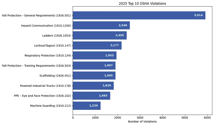 The Occupational Safety and Health Administration (OSHA) has released its annual list of the Top 10 most frequently cited standards for 2025. This list highlights areas where employers may need to improve their safety and health programs to protect their workers.